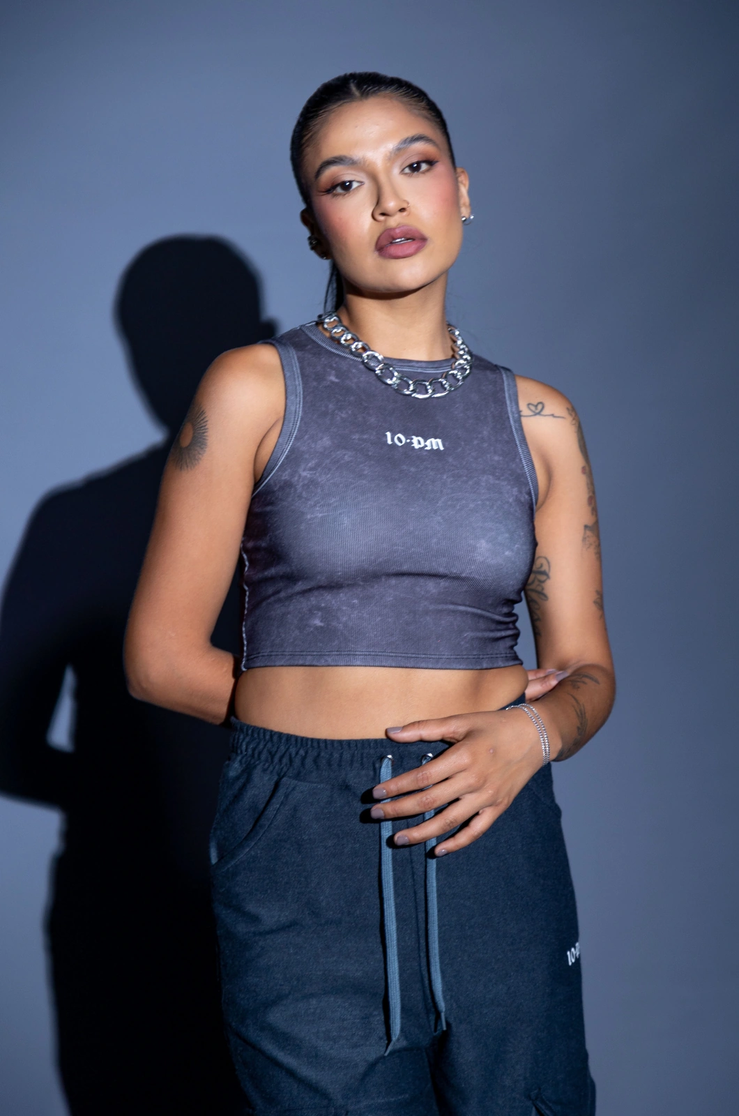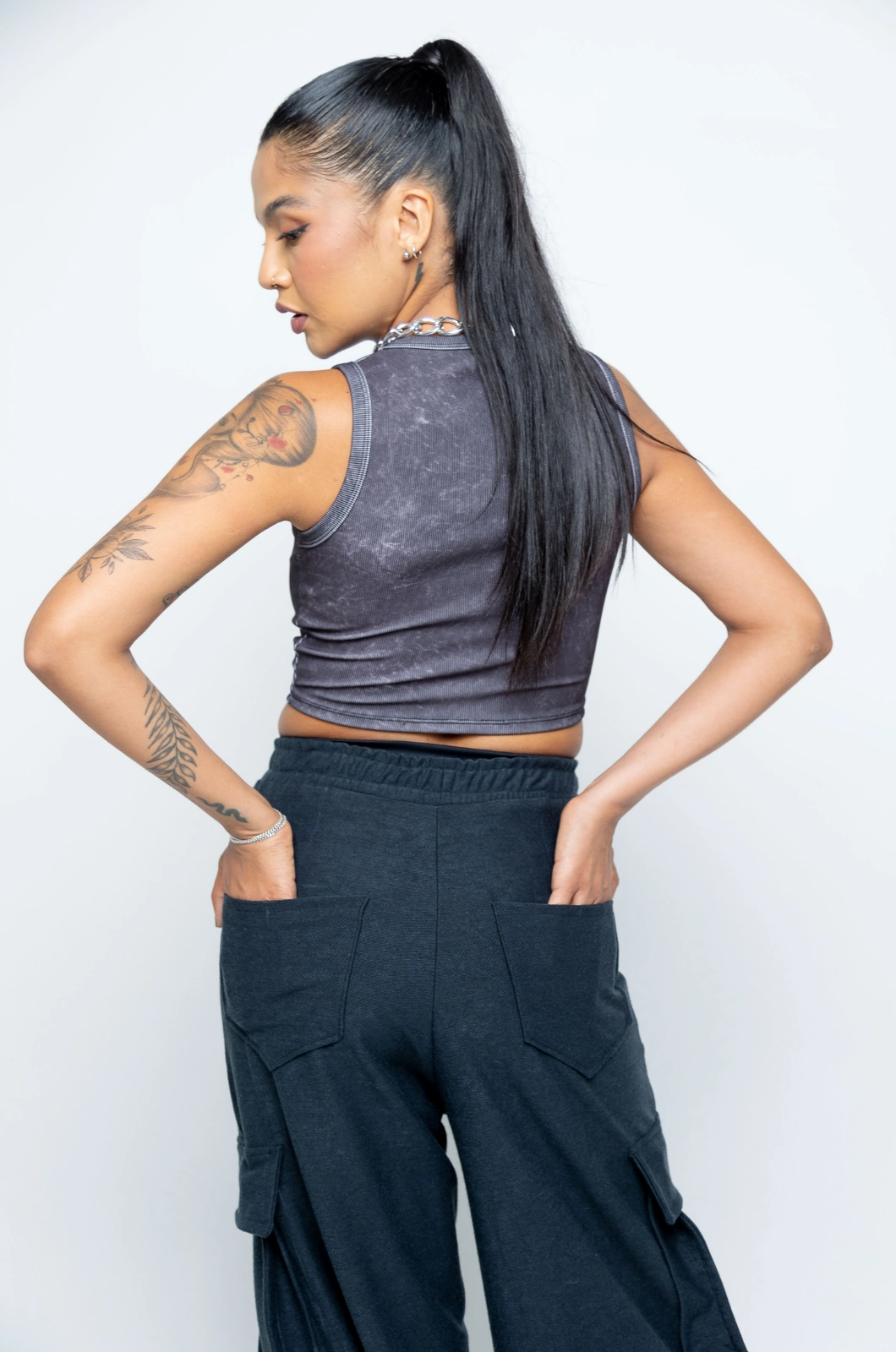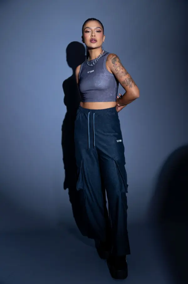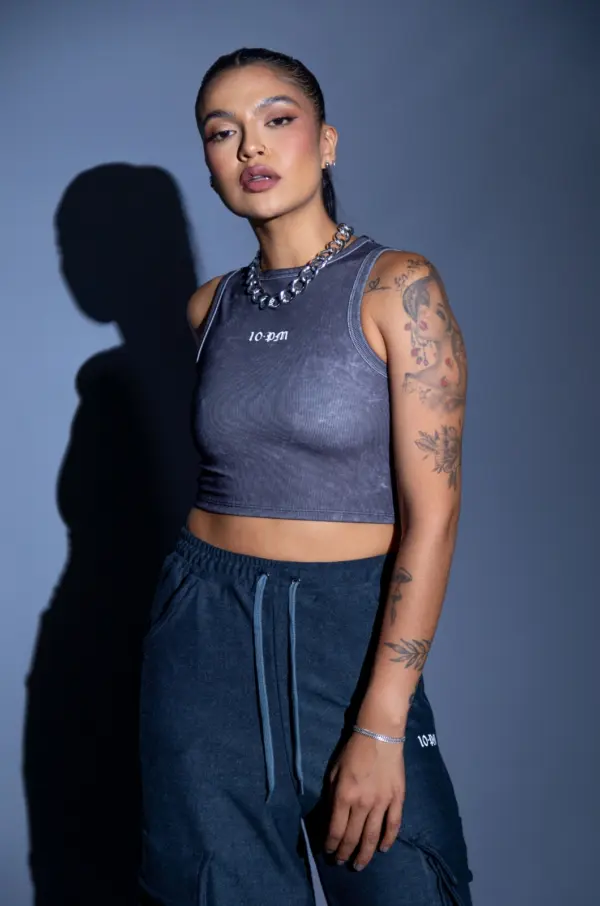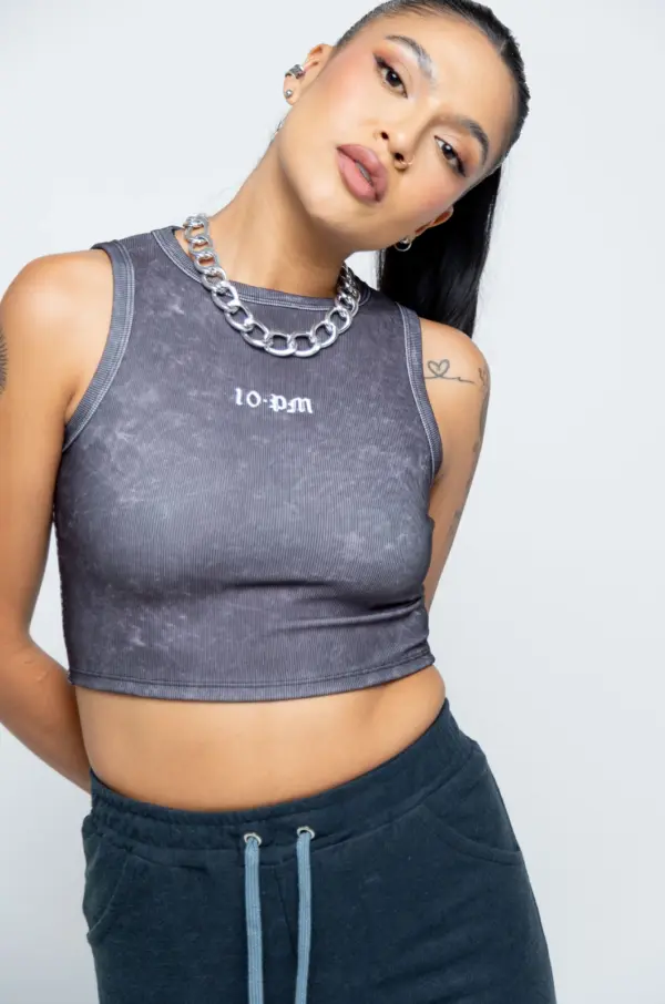 Cropped en tela rib con estampado acid wash, Logo estampado en frente en vinilo.