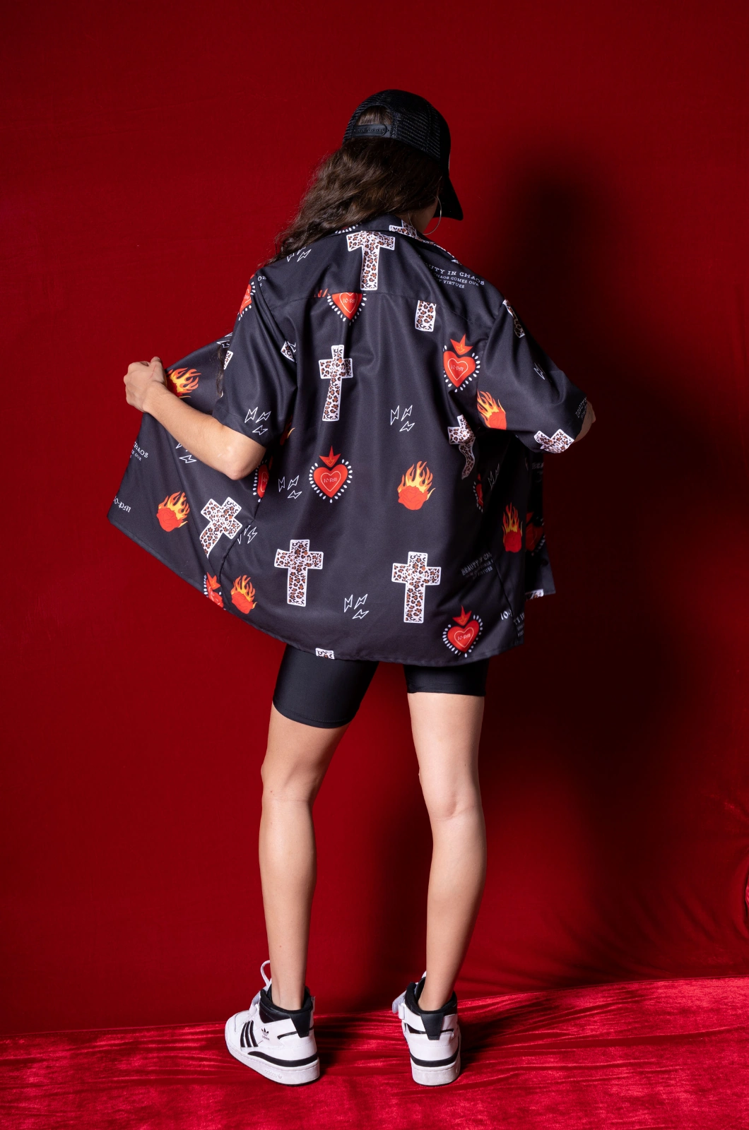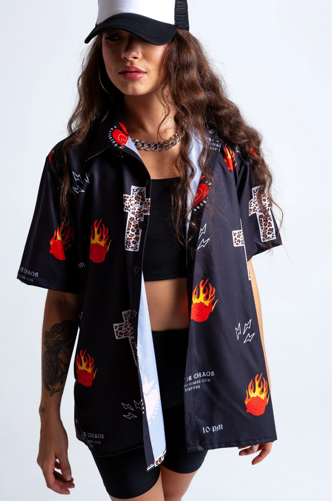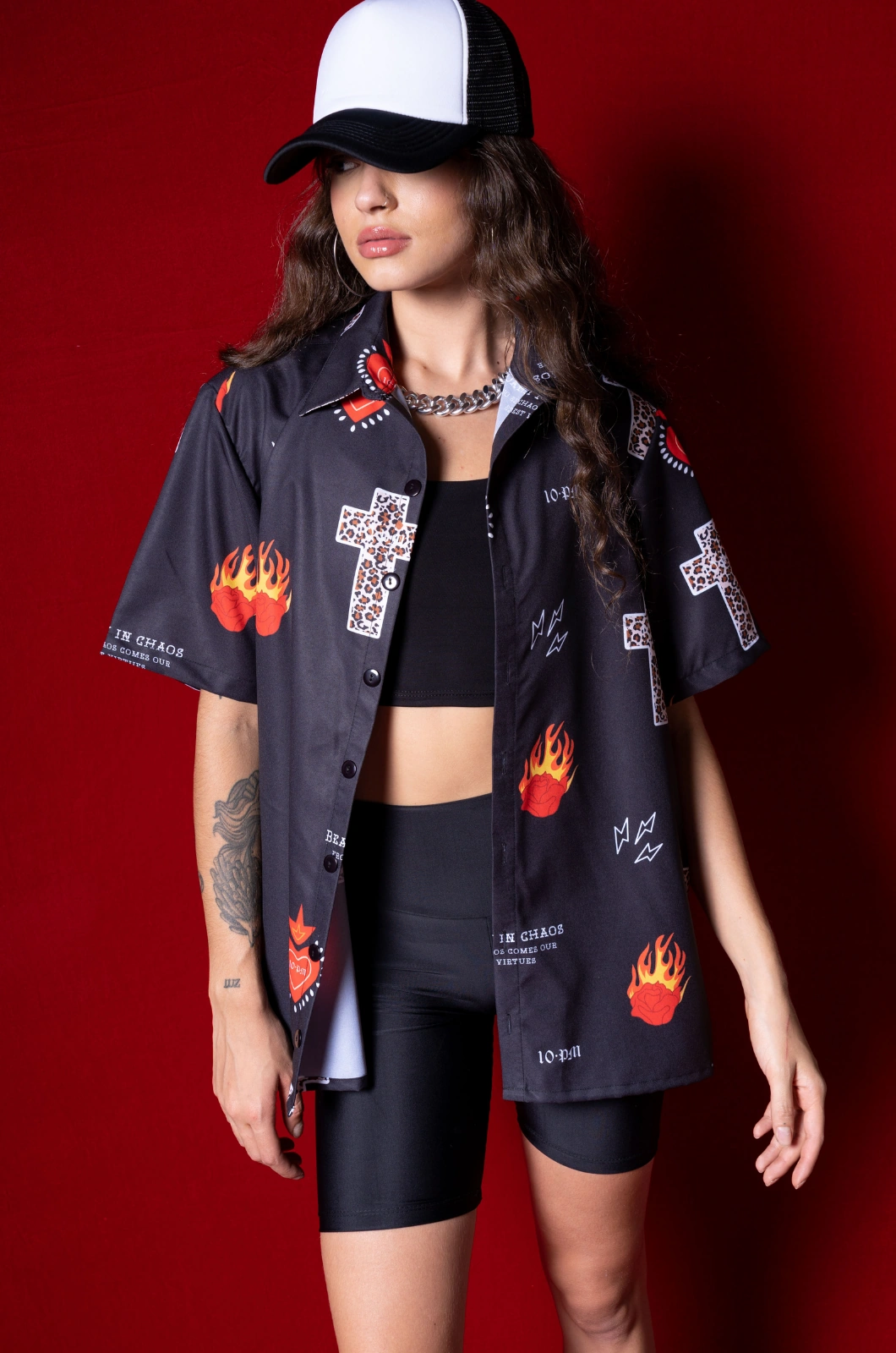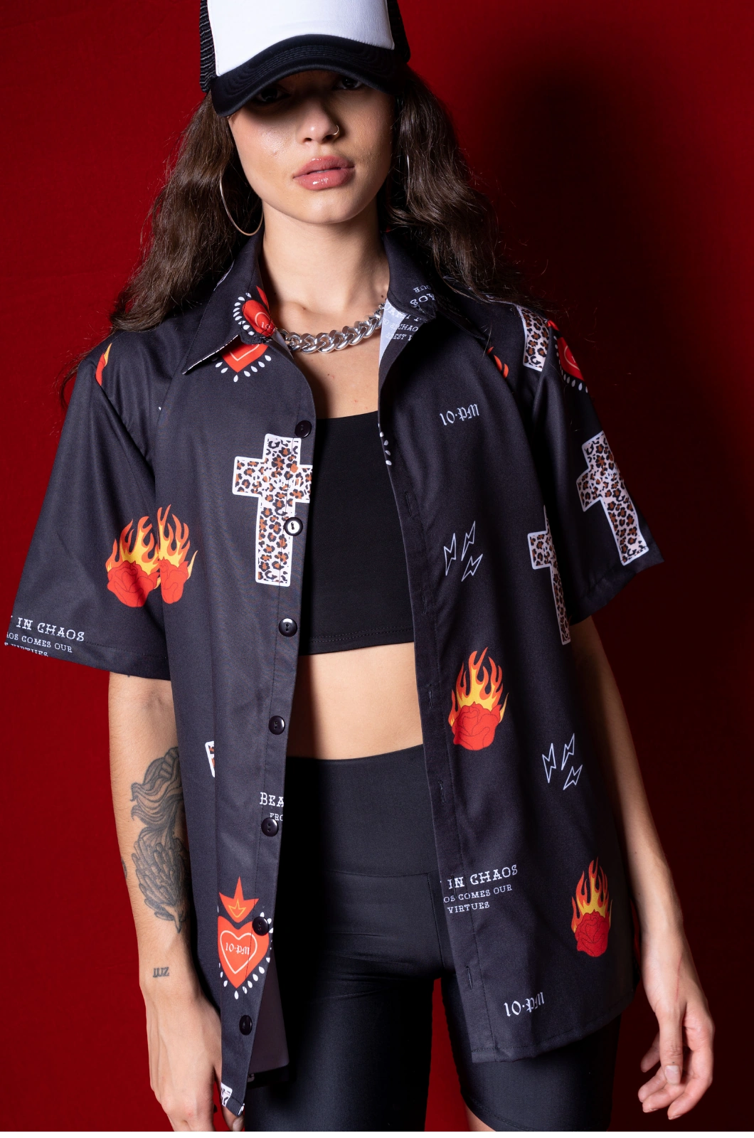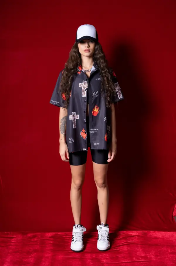 Camisa de botones ligera, en seda rolex, con estampado en sublimación con diseño exclusivo de la marca y botones delanteros