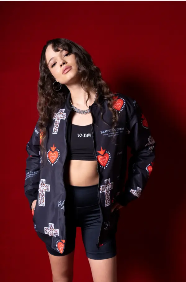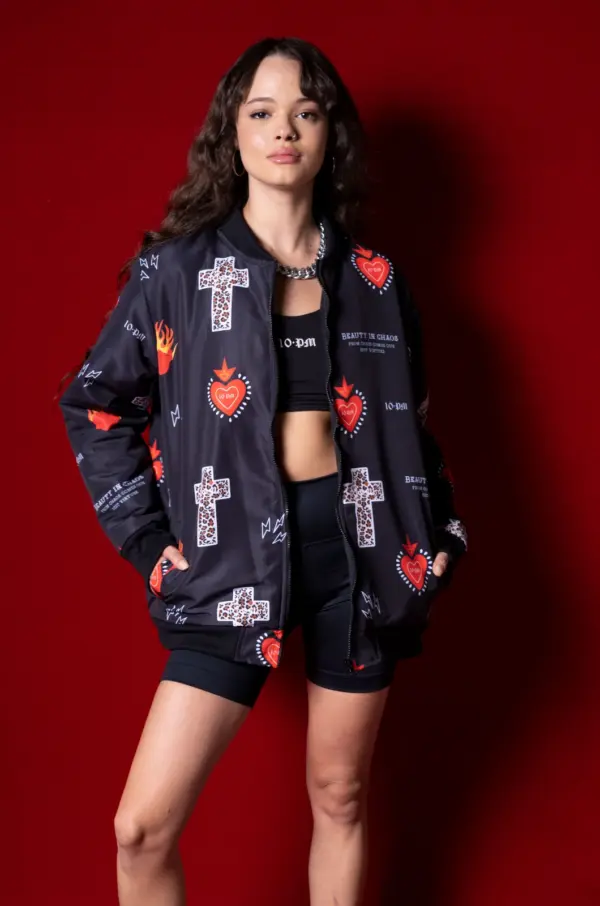 Chaqueta unisex en antifluido, estampado en sublimación con diseño exclusivo de la marca, abullonada, rib en cuello, puños y ruedo, bolsillos delanteros y cierre.