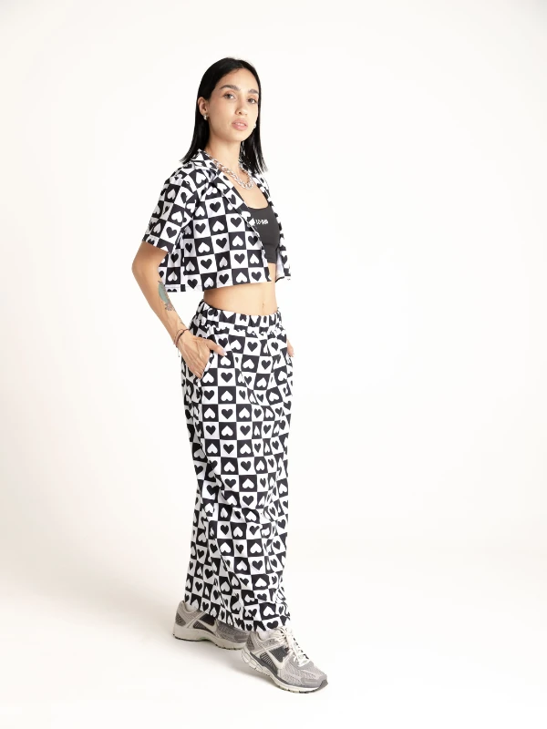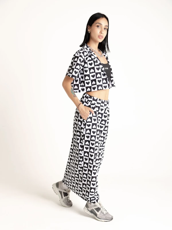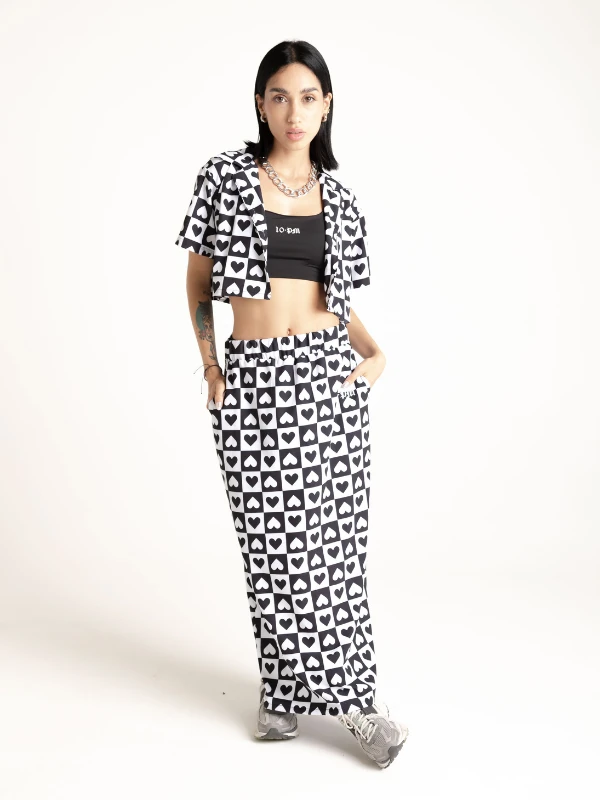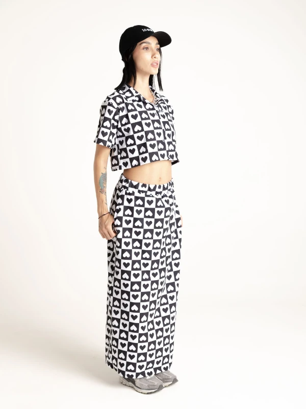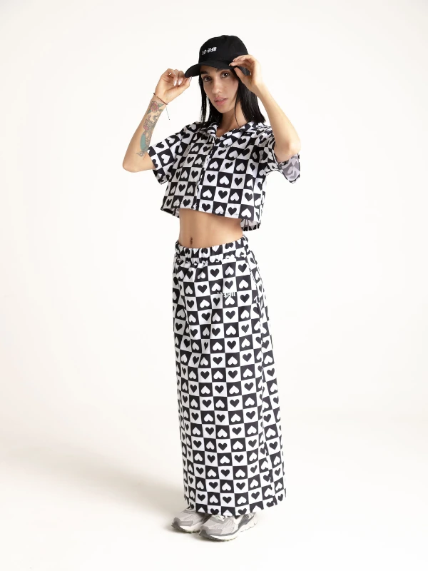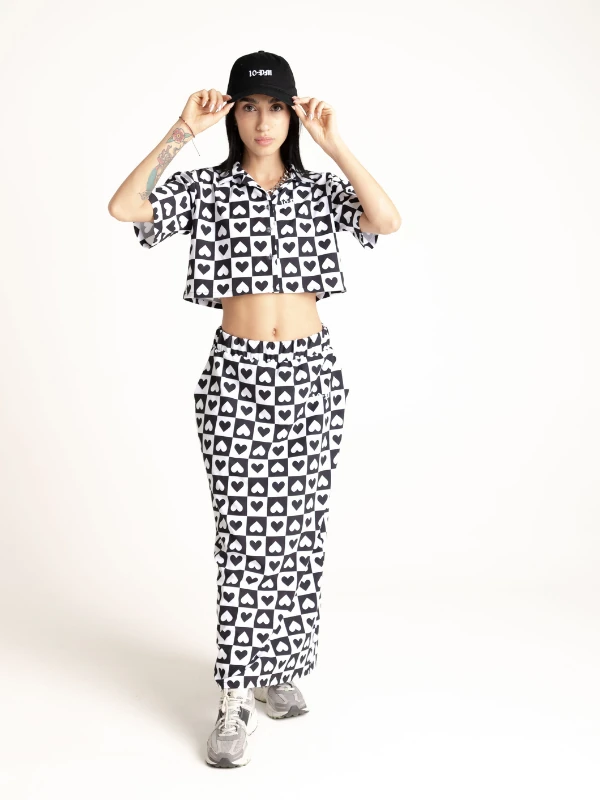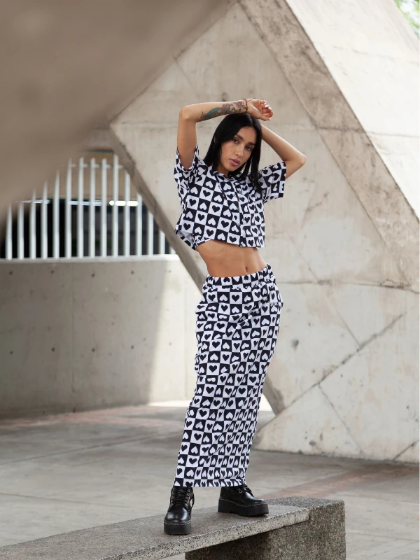 Set de camisa corta y falda larga en seda mango, estampado en sublimación con diseño exclusivo de la marca, logo en frente en camisa y falda.