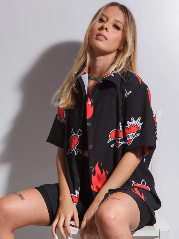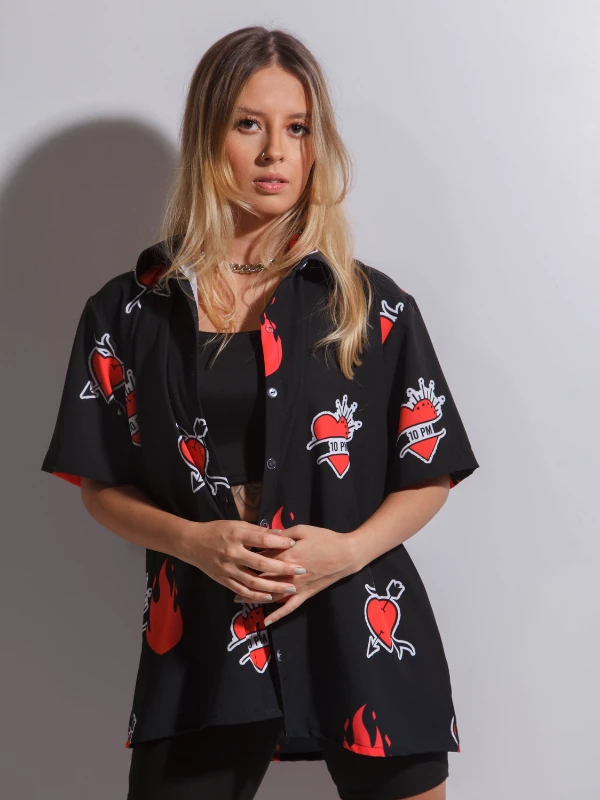 Camisa de botones ligera, en seda mango , con estampado en sublimación con diseño exclusivo de la marca y botones delanteros.