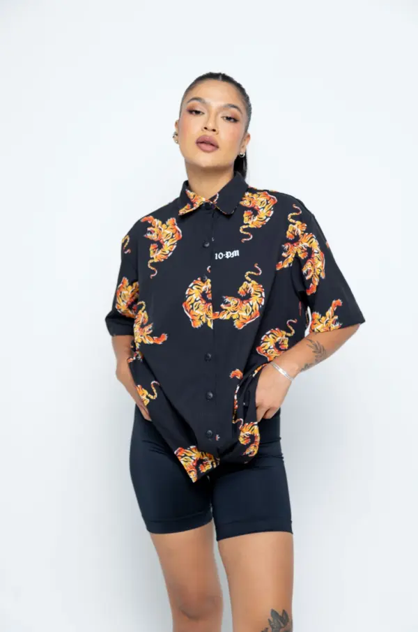 Camisa de botones ligera, en seda mango , con estampado en sublimación con diseño exclusivo de la marca y botones delanteros.