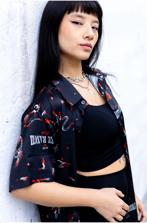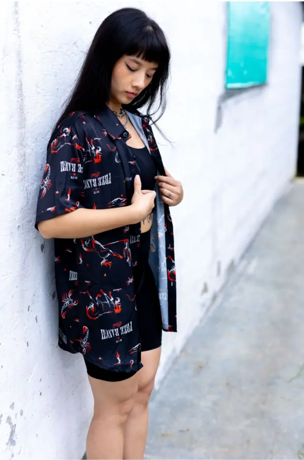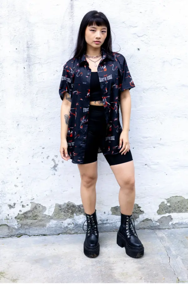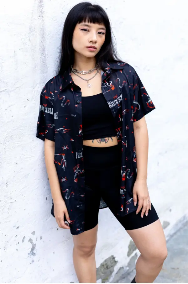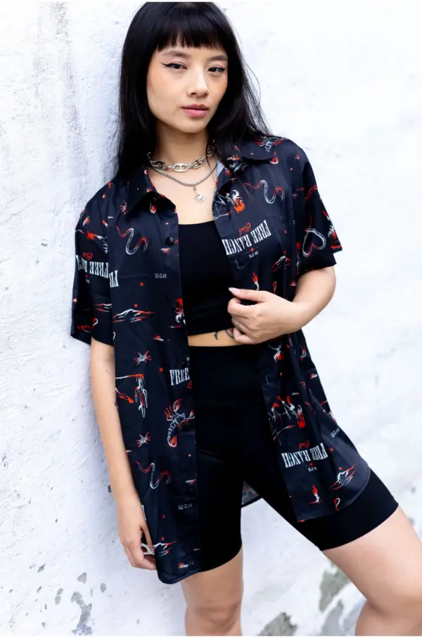 Camisa de botones ligera, en seda, con estampado en sublimación con diseño exclusivo de la marca y botones delanteros