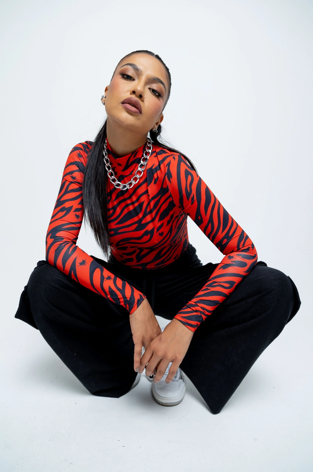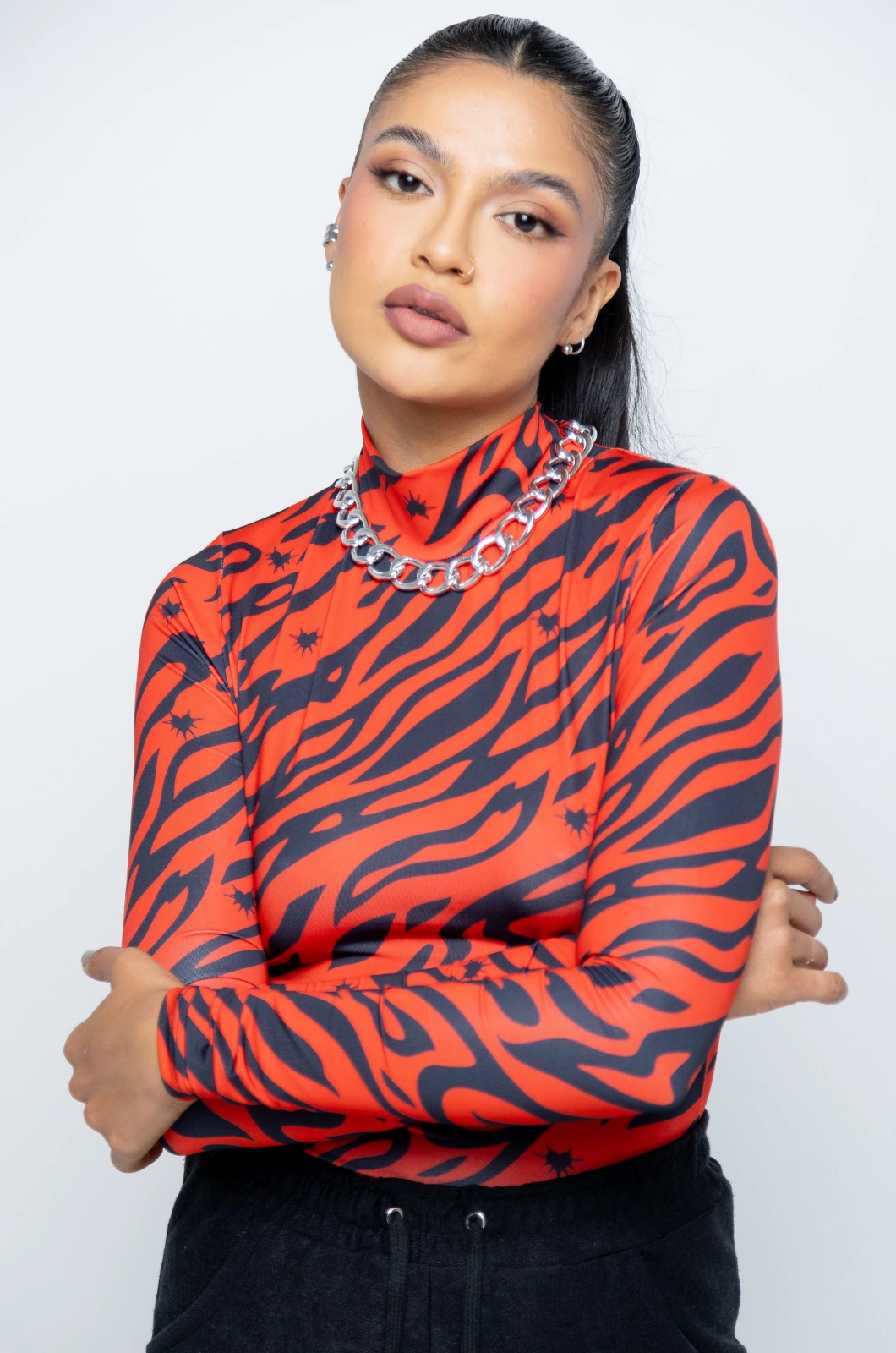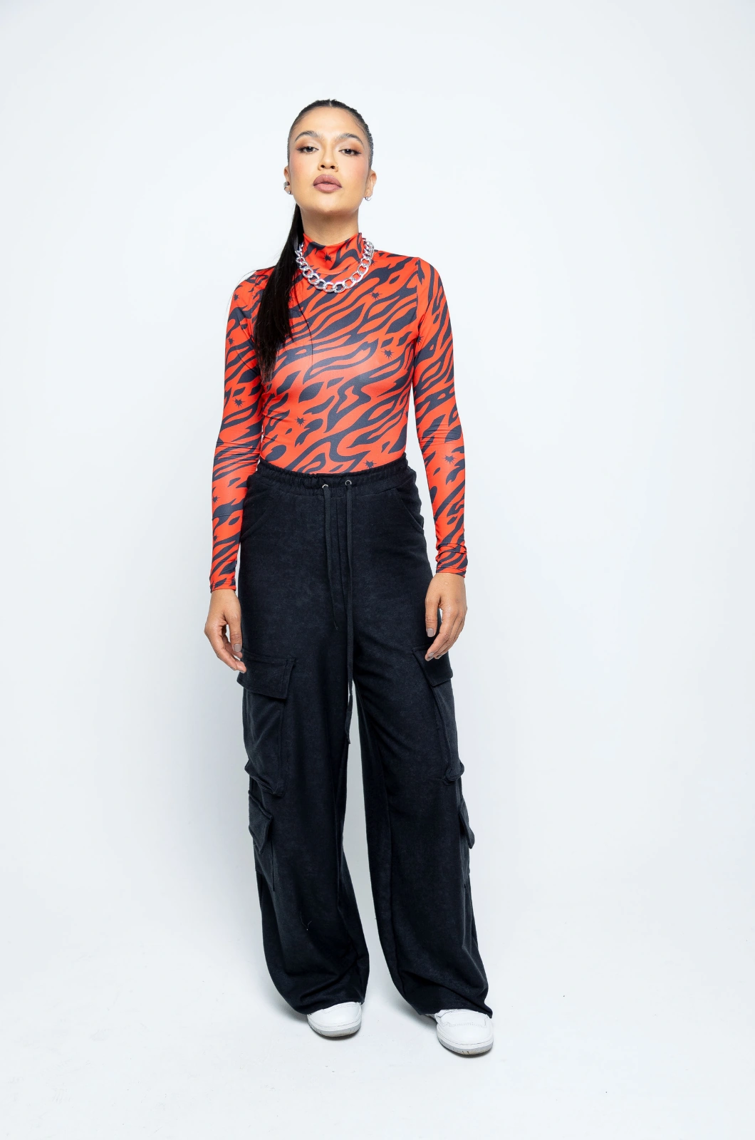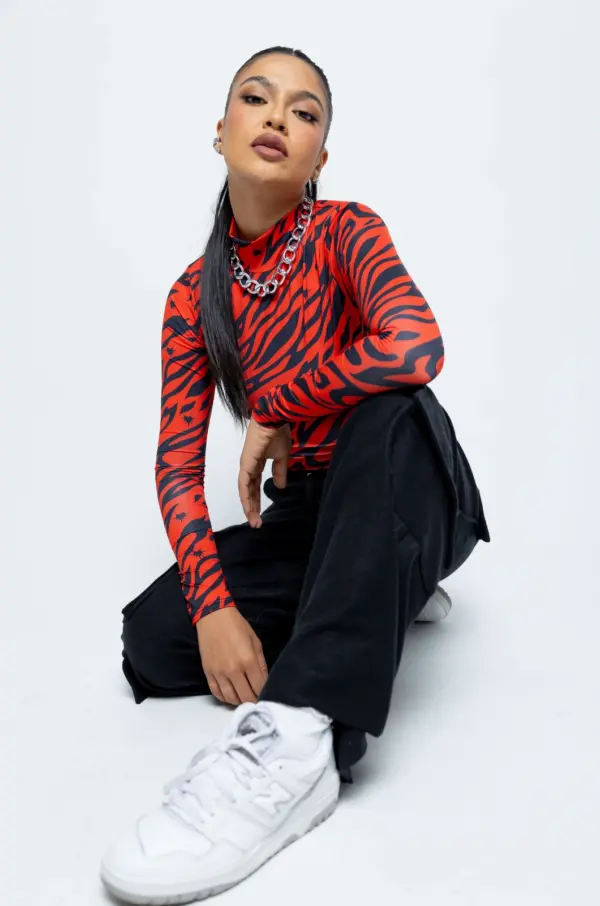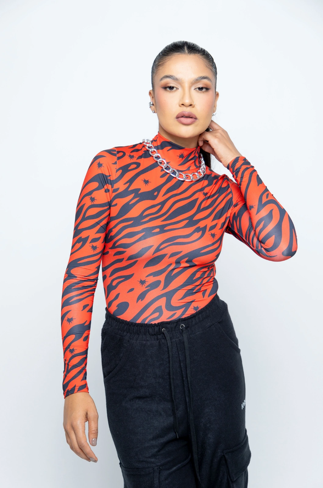 Body manga larga de cuello alto, con broches en la parte Interior, elaborado en lycra con estampado en sublimación con diseño exclusivo de la marca, logo estampado en vinilo en parte inferior izquierda.