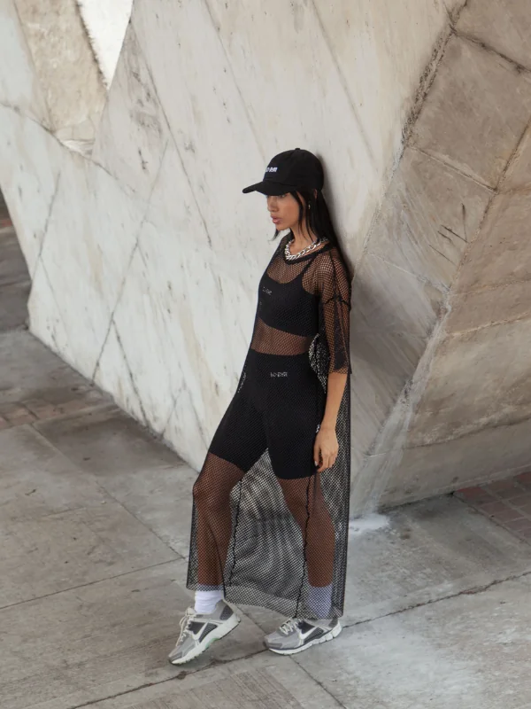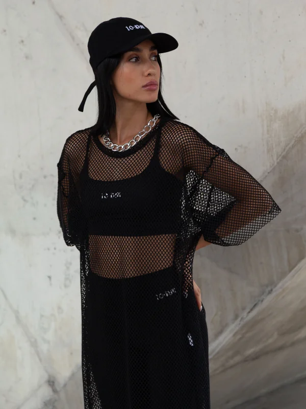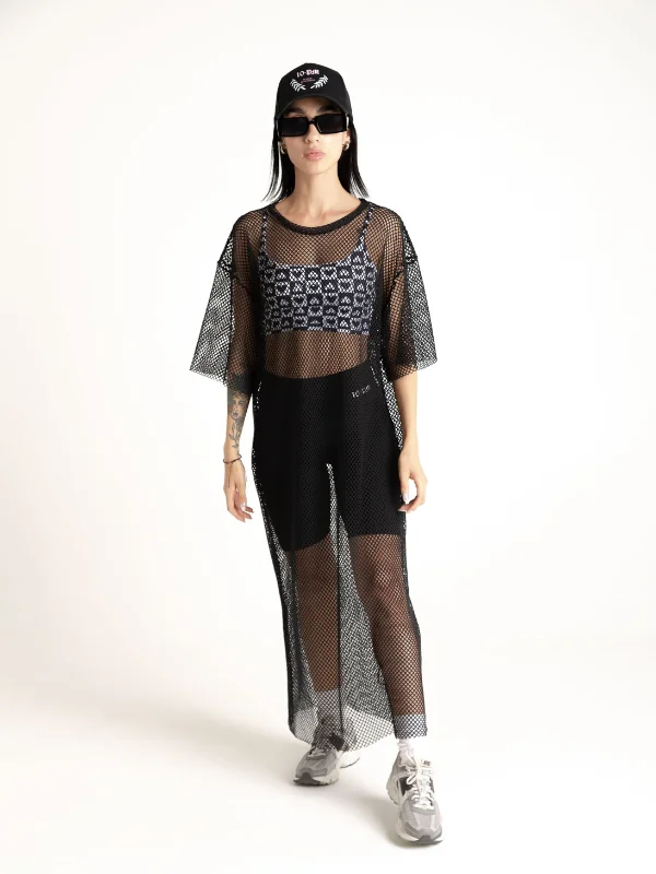 Vestido largo en malla tejida negra, amplio tipo oversized, manga corta