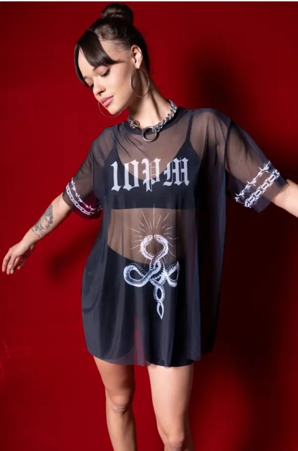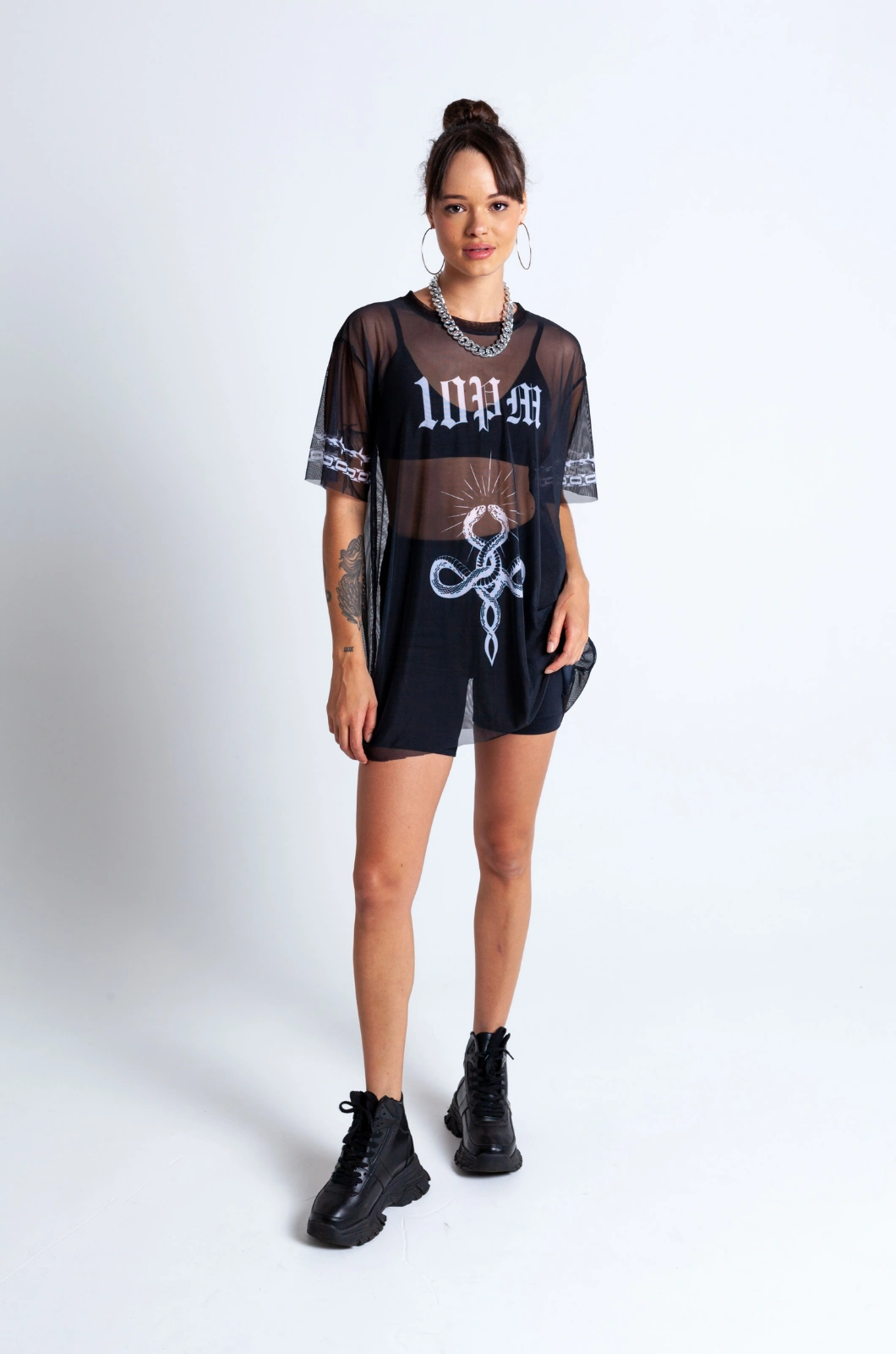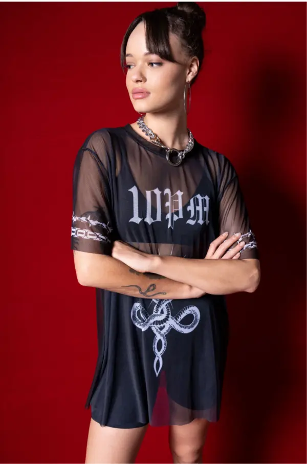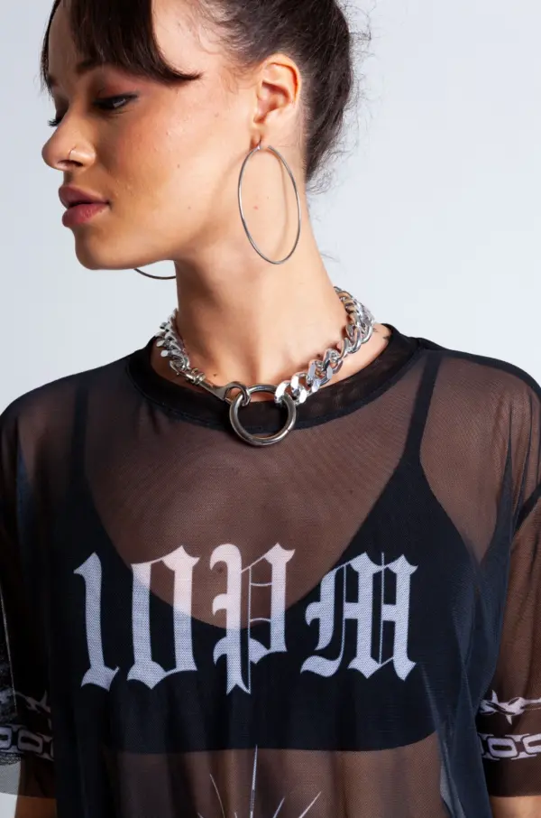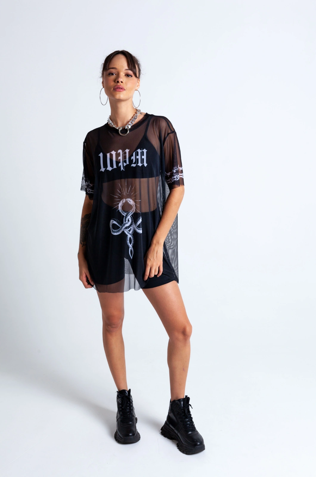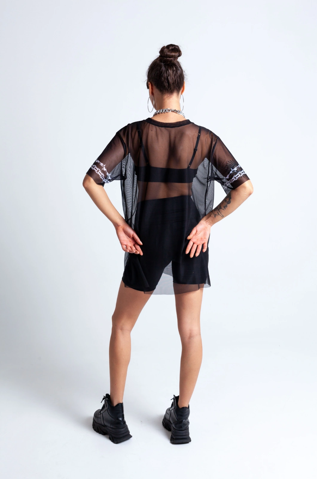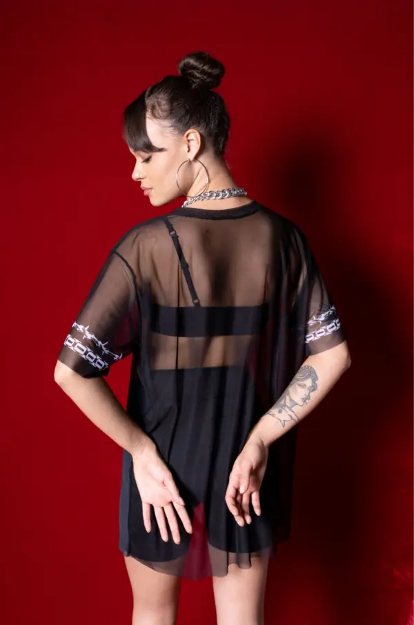 Oversized, en tela mallatex color negro, estampado en sublimación en frente y mangas con diseño exclusivo de la marca.