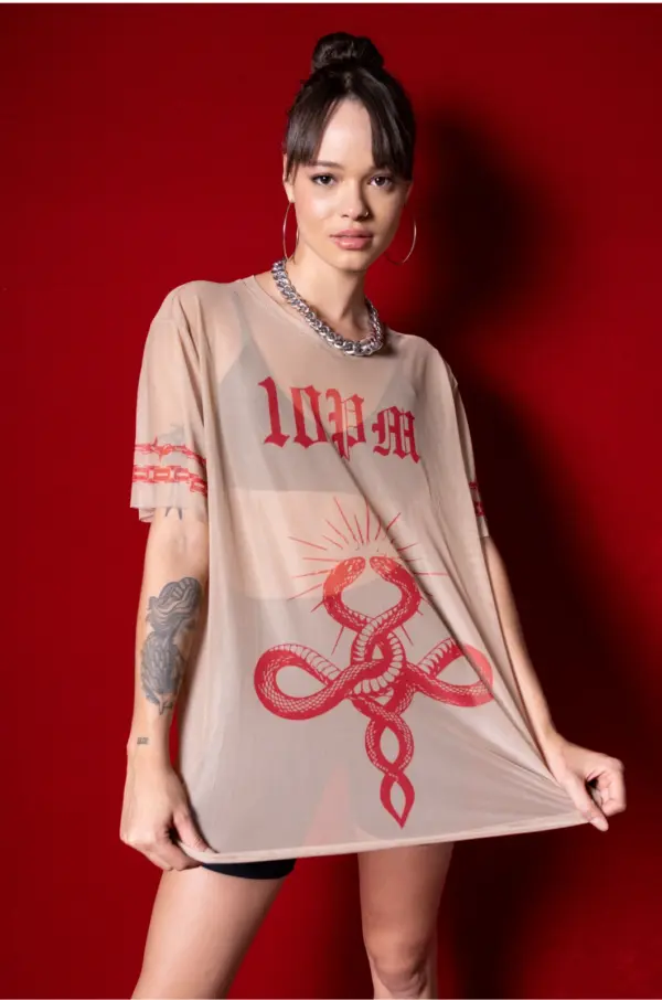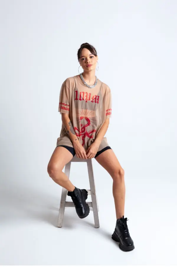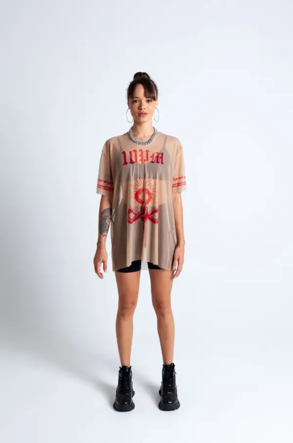 Oversized, en tela mallatex color nude, estampado en sublimación en frente y mangas con diseño exclusivo de la marca.