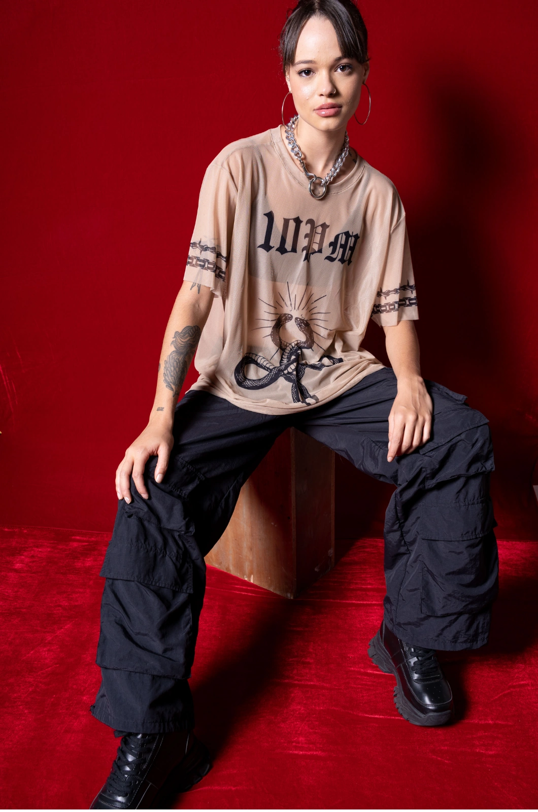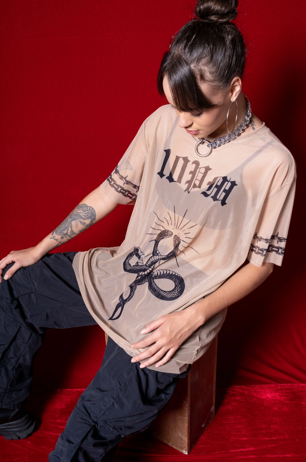 Oversized, en tela mallatex color nude, estampado en sublimación en frente y mangas con diseño exclusivo de la marca.