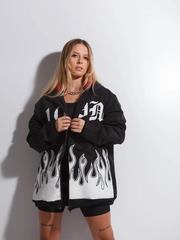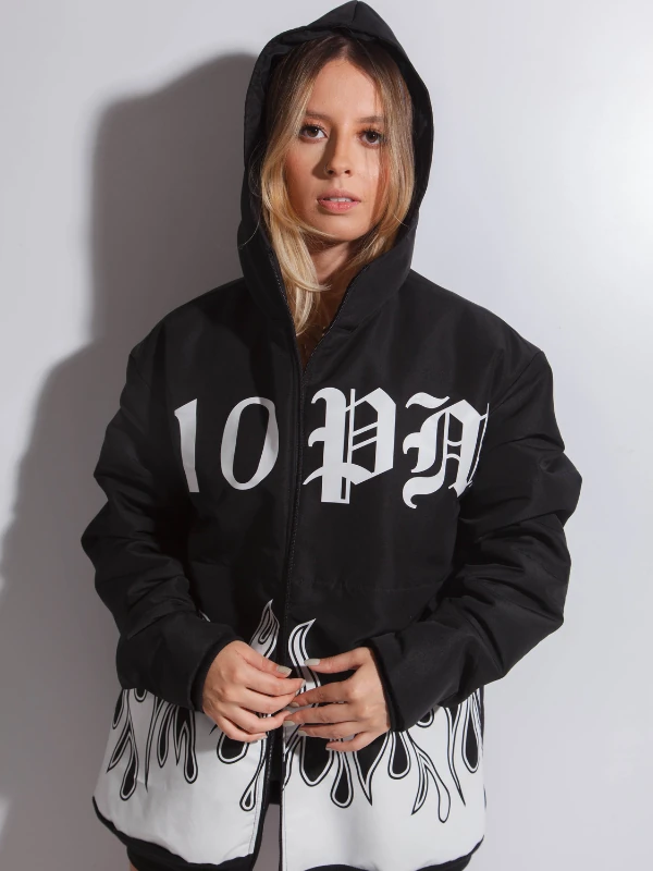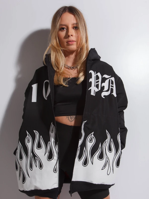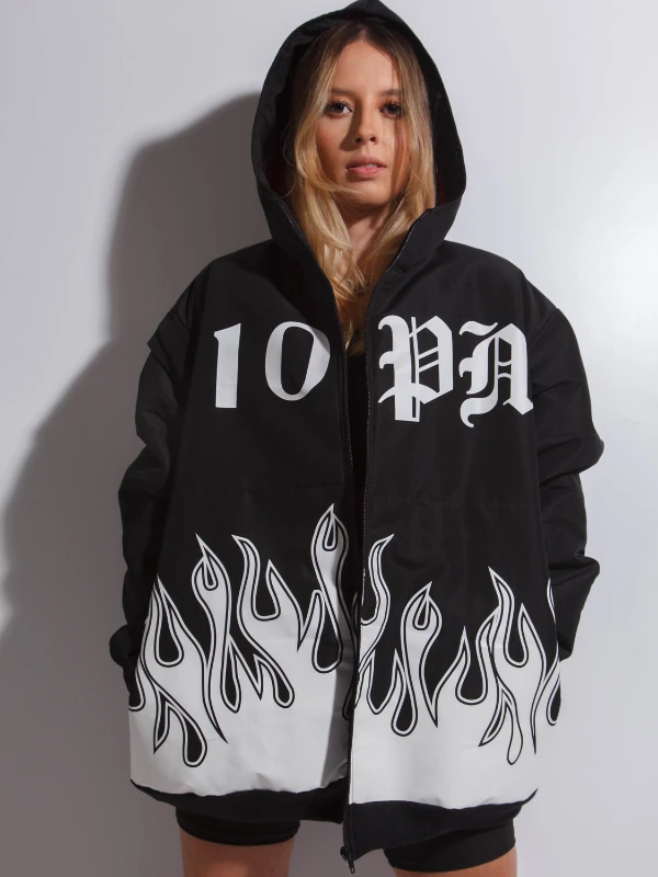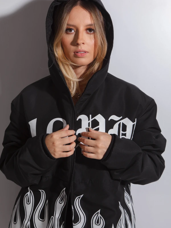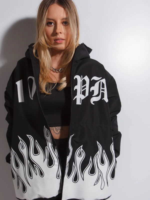 Chaqueta unisex en tela antifluido, con estampado en sublimación con diseño exclusivo de la marca, forrada totalmente, con capucha fija, abullonada, con bolsillos delanteros Y cierre.