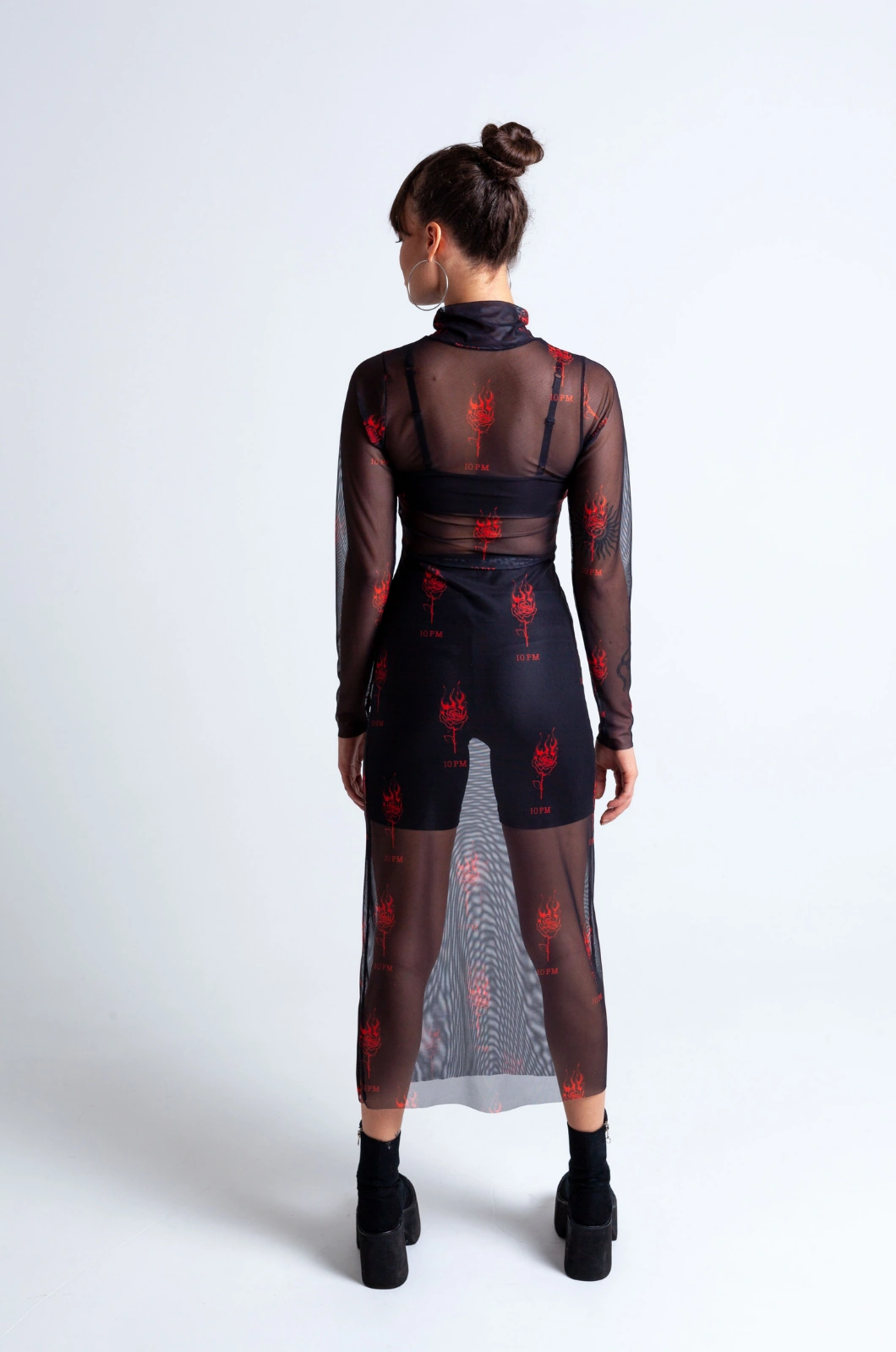 Vestido largo en malla estampada en sublimación con diseño exclusivo de la marca, ajustado al cuerpo, manga larga y de cuello alto