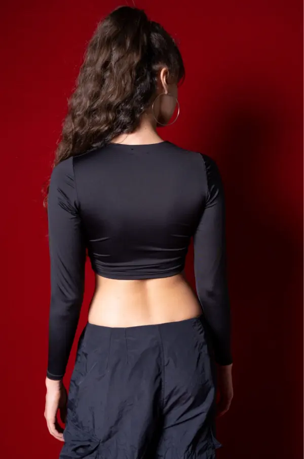 Buzo corto negro, en lycra poliester, con aberturas en el pecho y logo estampado en frente en vinilo